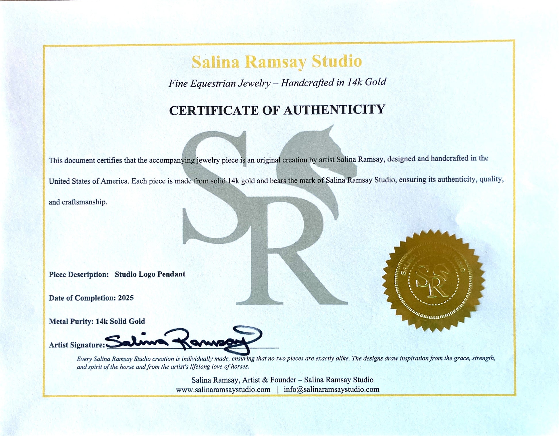A timeless emblem of refinement, the Salina Ramsay Studio Logo Pendant captures the essence of equestrian elegance with modern sophistication. Meticulously crafted in precious metal, the pendant bears the signature Salina Ramsay insignia — a symbol of heritage, artistry, and enduring style.